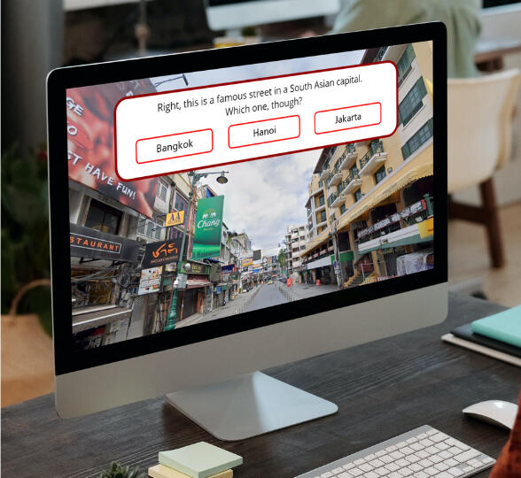 This is a simple quiz that showcases how Storyline 360 can be used to create game-like experiences to test the learner's knowledge.I used a program called Street View Downlad 360 to get the 360º panoramic images and a few Storyline triggers and layers did the trick.