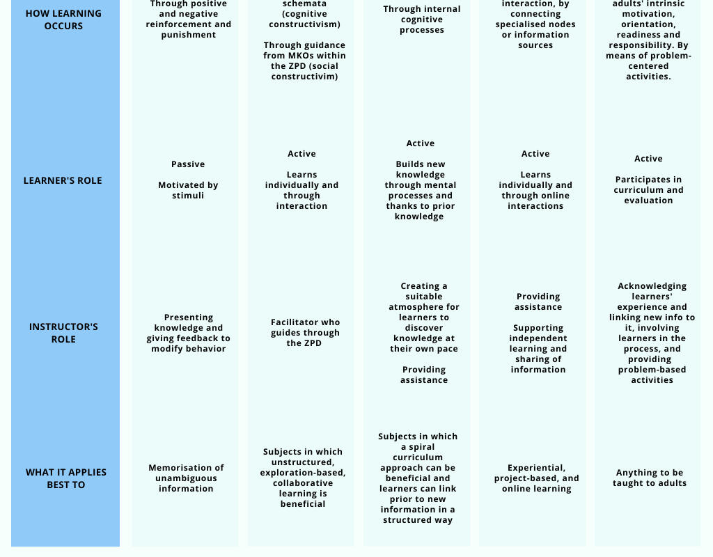 A mix of learning theories affected the creation of this e-learning experience. First of all, since course takers are supposed to be adult professionals, andragogy’s assumptions play a big role in the way the course is structured. Learners perfectly know why they are taking the course and are highly motivated, but reflection on past experiences can further increase their motivation. Also, the learner’s self control assumption aligns with the idea of learners doing guided research and optional activities on their own to better learn about the various tools.