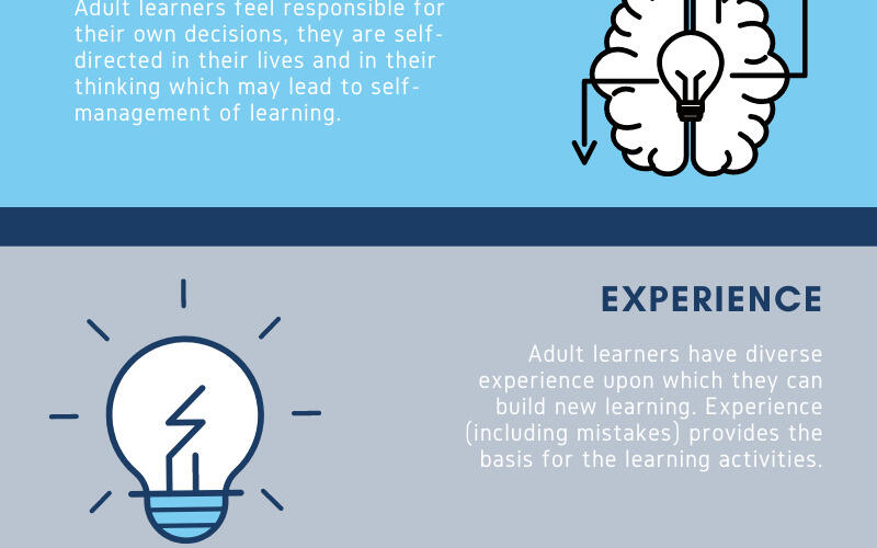 The learner’s self-concept. Adults are aware of their responsibility over their lives and as a consequence they tend to feel more comfortable if they feel they are in control of the learning experience. This is especially true for those who have an internal locus of control.