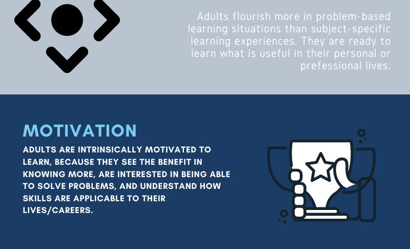 The learner’s orientation to learning assumption states that adults learn better when they are given task-oriented learning exercises as they can see them aligned to practical daily-life situations. Learning by doing also boosts adults’ confidence and motivation.