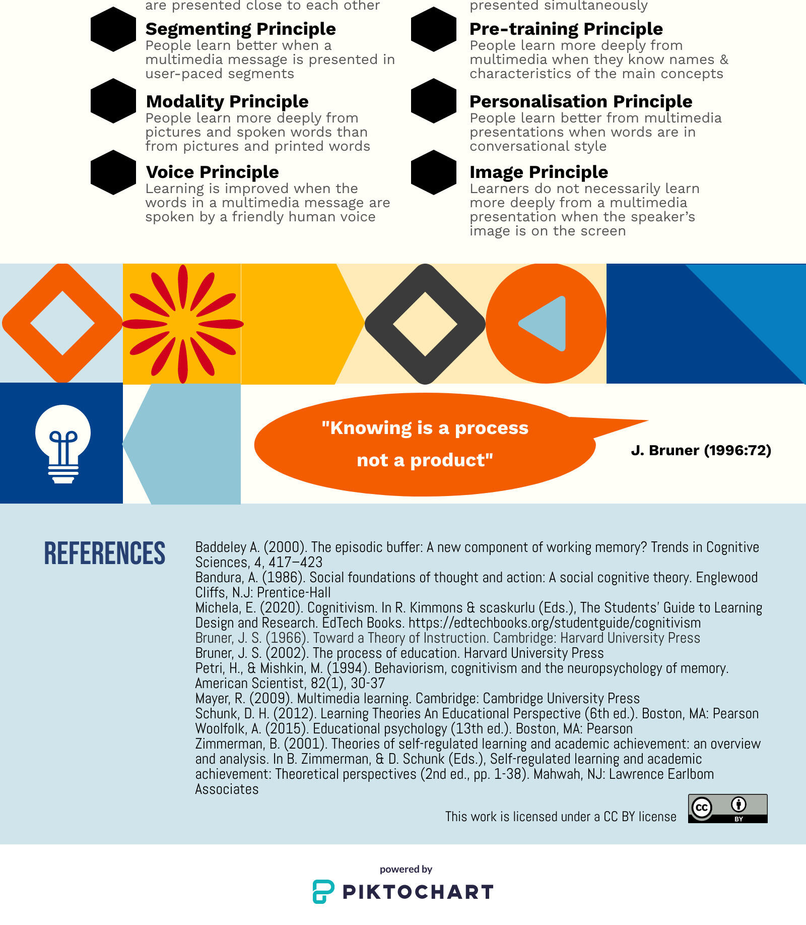 Finally, it should be pointed out that the instruction is an e-Learning course; therefore, Mayer’s 12 principles of multimedia learning (cognitivism) were definitely taken into consideration when presenting contents.